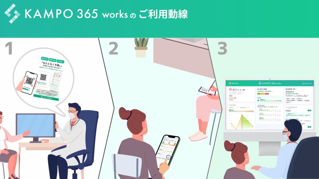 1.診察中、医師が患者さんに「KAMPO 365 works」をご提案し、デジタル問診票へのアクセス方法としてQRコードを案内します。