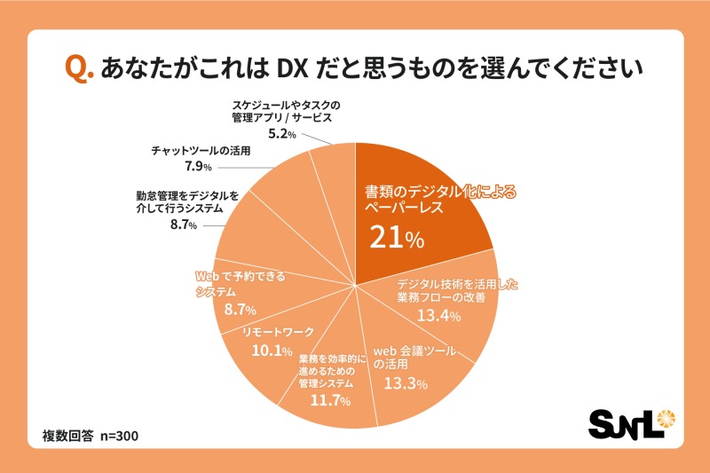 DXだと思う取り組みとして最も多くの回答を集めたのは、「書類のデジタル化」であり、21.0%がこれを挙げました。続いて「デジタル技術を活用した業務フローの改善」が13.4%、「Web会議ツールの活用」が13.3%という結果から、多くの人が書類のデジタル化をDXの一環と認識していることが明らかになりました。