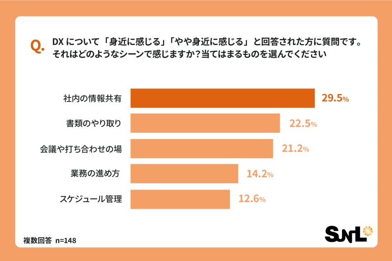 「身近に感じる」「やや身近に感じる」と回答した人に対して、DXを身近に感じる業務上の場面について聞いたところ、最も多かったのは「社内の情報共有」で、29.5%がこれを挙げました。続いて、「書類のやり取り」が22.5%で2位、「会議や打ち合わせの場」が21.2%で3位となり、多くの社員が情報共有やコミュニケーションの場面でDXを感じていることが明らかになりました。