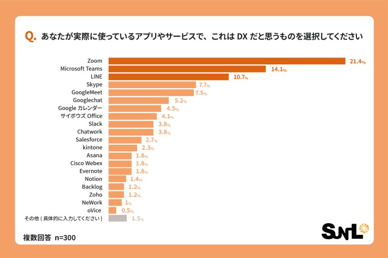 実際に利用しているアプリやサービスで、DXだと感じるものを聞いたところ、1位は「Zoom」で21.4%でした。2位には「Microsoft Teams」が14.1%で続き、3位には「LINE」が10.7%を獲得しました。この結果から、Web会議ツールが上位を占めることがわかりました。